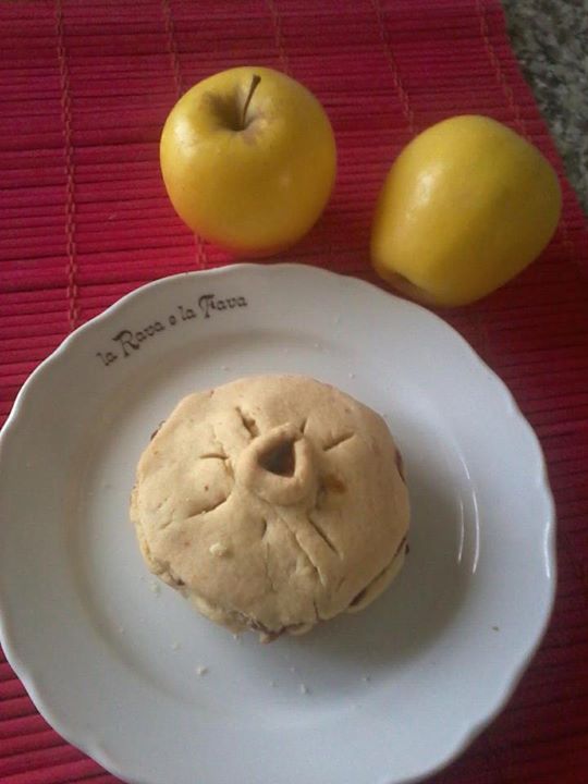 Foderare dunque un pirottino con il primo disco in modo da coprire anche i lati. Bucherellare il fondo e poi porre una montagnettla di mele all'interno, in modo che il centro sia più altro e superi un pochino l'altezza dei bordi. Ricoprire con il secondo disco di sfoglia e con un coltello fare qualche taglietto laterale (non tagliare il centro/punta della copertura) sulla pasta per areare e decorare.