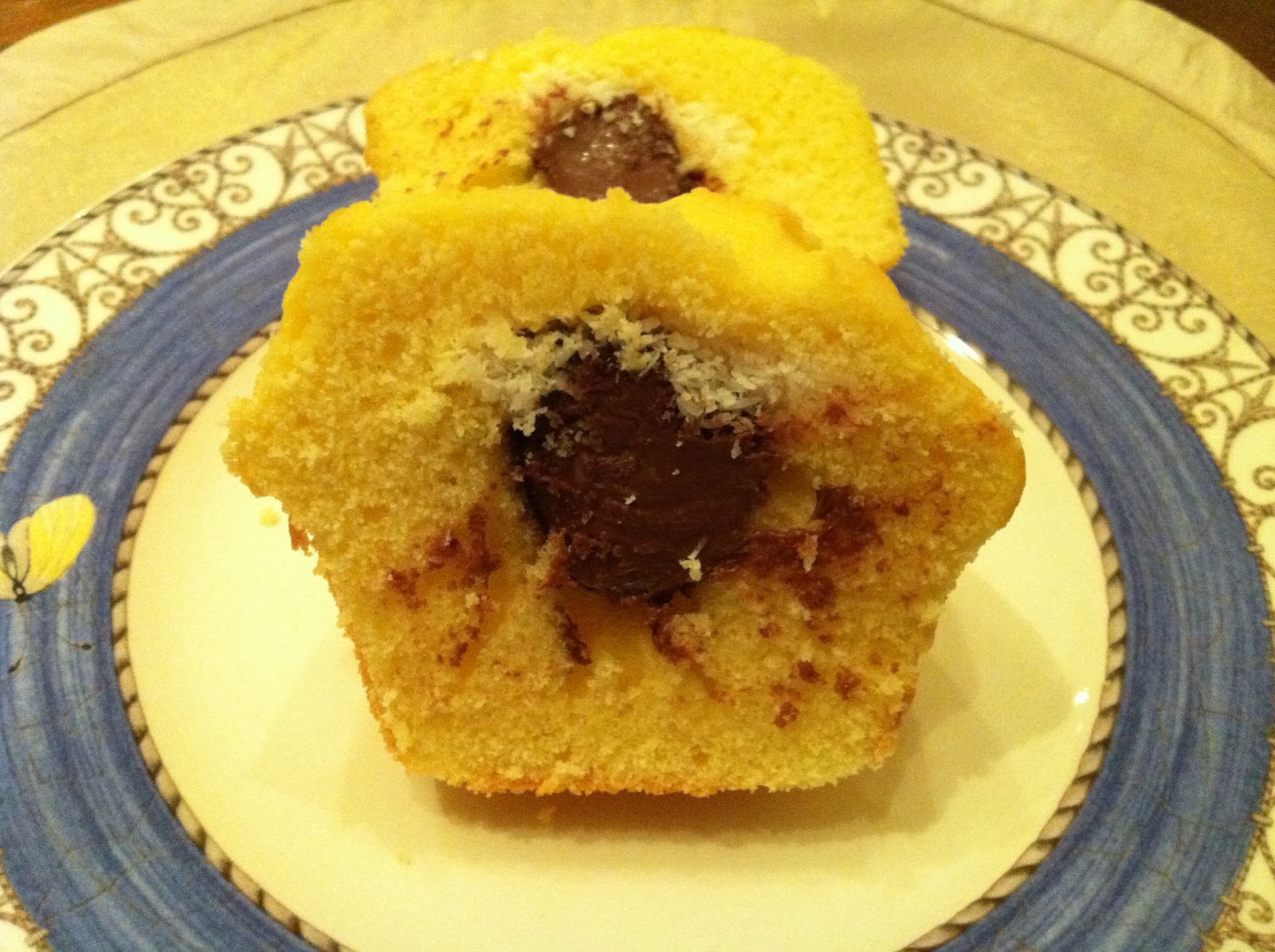 Estrai dalle vaschette il ripieno congelato e inserisci al centro di ogni muffin, premendo leggermente poi copri con un altro cucchiaio di impasto di modo che copra completamente il cuore.