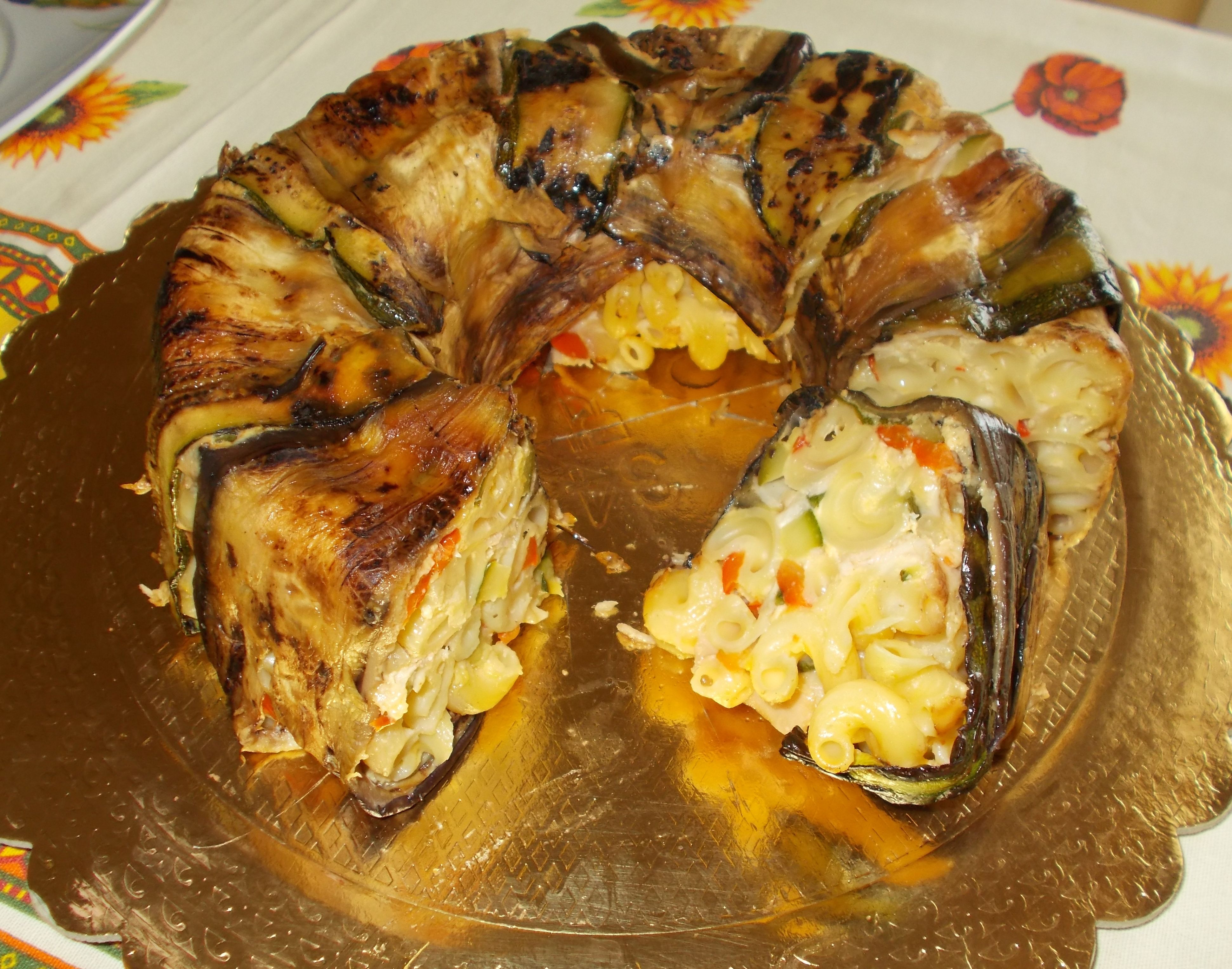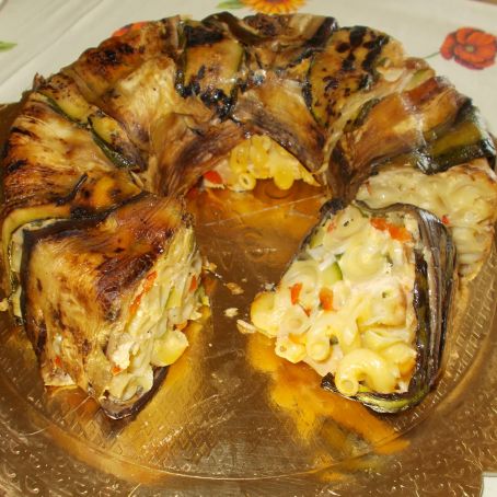 Ha imburrato molto bene, uno stampo per ciambella (nel nostro caso la pentola fornetto), ed ha messo prima ad alternare una fetta di melanzana e una di zucchina, fino a terminarle, e poi ha aggiunto la pasta ed ha richiuso il tutto con le melanzane e le zucchine che uscivano dal bordo della tortiera.