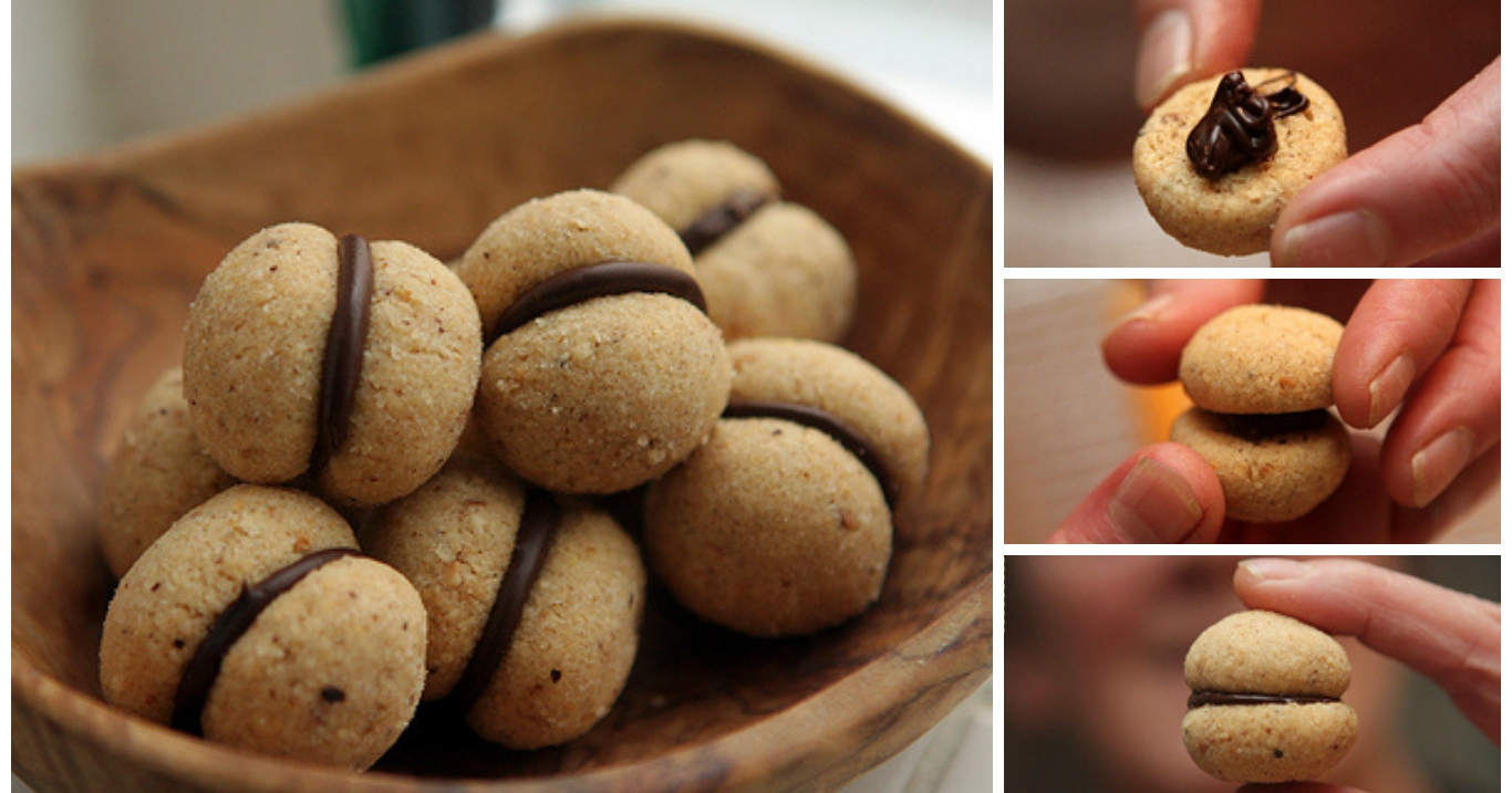 Polverizzare le mandorle e lo zucchero;unire a poco a poco tutti gli altri ingredienti tranne il cioccolato;con l'impasto ottenuto formare delle palline, disporle su una teglia e infornare a 160° per 30 minuti circa.Nel frattempo sciogliere il cioccolato a bagnomaria e appena i biscotti sono freddi stenderne un cucchiaino tra due biscotti e far rapprendere ponendoli in frigo.
