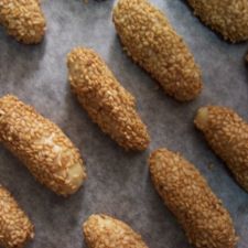 Impastate la farina con lo strutto, lo zucchero, la buccia del 1/2 limone grattugiata, il lievito, le uova battute e il latte. Lavorate bene gli ingredienti. Con la pasta ottenuta fatene una palla, copritela con un canovaccio e lasciatela riposare per un po'; quindi riprendetela, mettetela sulla spianatoia infarinata, stiratela e ricavatene dei bastoncini della grossezza di un dito e lunghi 4-5 cm. Passateli nell'uovo battuto poi nei semi di sesamo, adagiateli sulla piastra del forno imburrata e cuoceteli in forno a 180° fino a che saranno dorati.