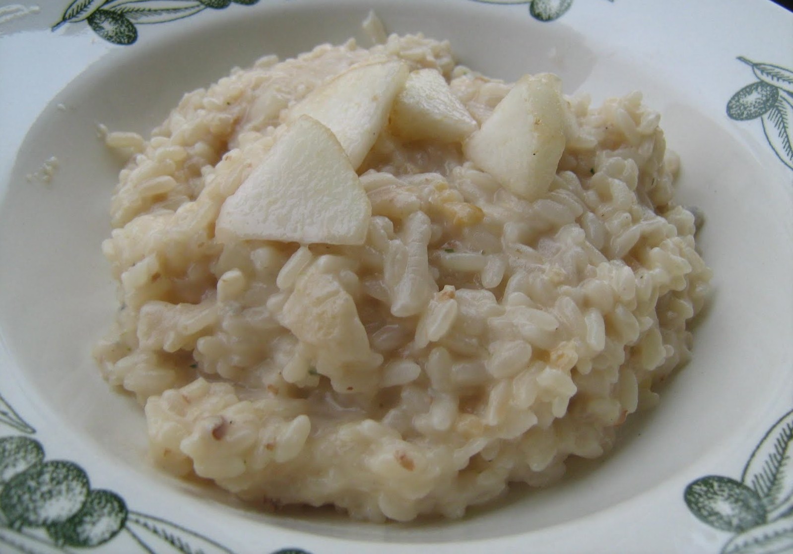 Tritare e soffriggere la cipolla in un pò d'olio. Aggiungere il riso e farlo tostare. Sfumare con il vino ed aggiungere il brodo un pò per volta. Aggiustare di sale e pepe e lasciare cuocere. Circa 5 minuti prima della fine della cottura aggiungere il gorgonzola a pezzetti e le pere tagliate a tocchetti. Mescolare bene, completare la cottura, incorporare il parmigiano, servire e spolverizzare con gherigli di noci.