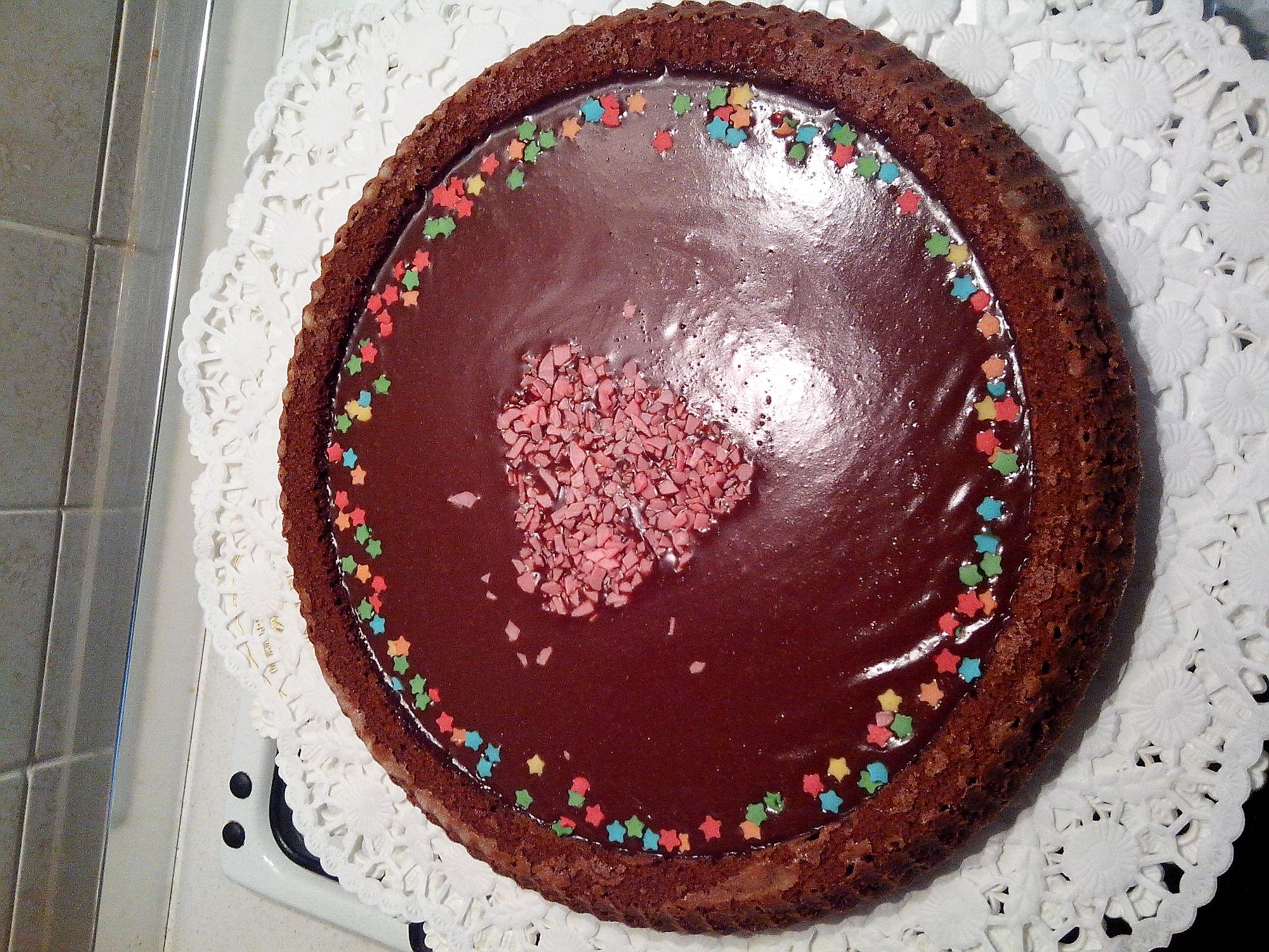 Prepariamo la base sciogliendo il cioccolato fondente ed il burro(io l'ho fatto nel microonde) ed impastarlo con il resto degli ingredienti , mettere il tutto nello stampo con il centro rialzato e cuocere in forno caldo a 175 ° per 20 minuti. Mentre la base cuoce tritiamo il cioccolato al latte e mettiamo a scaldare la panna con il burro,quando arriva a bollore togliamo dal fuoco ed aggiungiamo il cioccolato tritato mescolandolo fino a che non si è sciolto. To9gliamo la torta dal forno la capovolgiamo e versiamo il cioccolato sciolto nell'incavo della crostata. A questo punto bisogna solo attendere che il cioccolato si solidifichi e per questo ci vogliono diverse ore se volete accelerare i tempi quando è completamente fredda la potete mettere in frigo