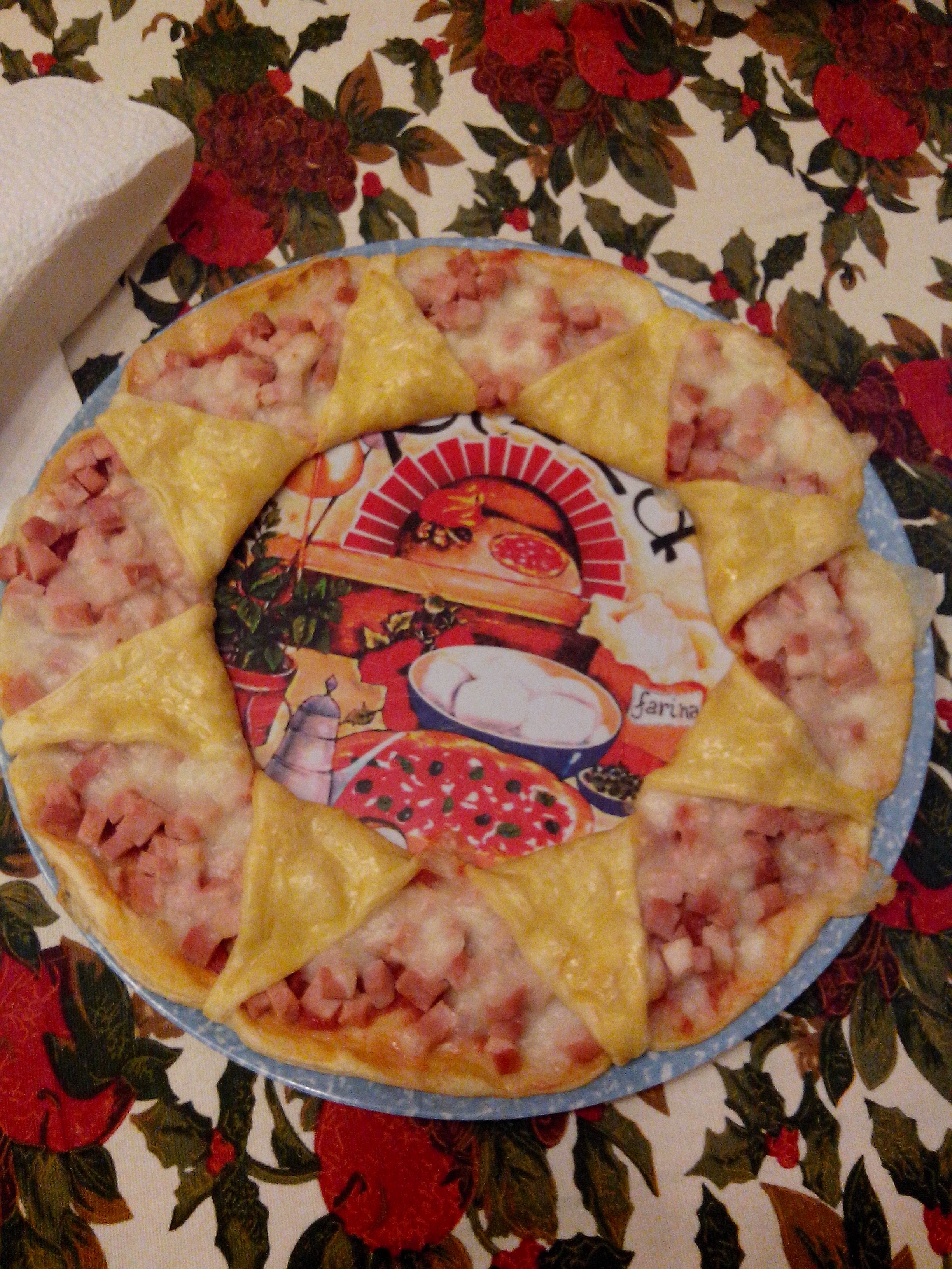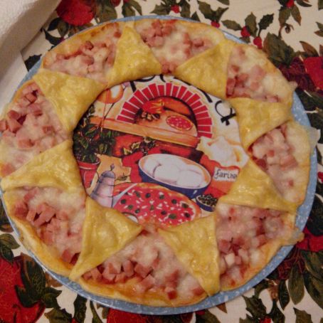 stendere il foglio di pasta tagliare 8 spicchi che partono dal centro fino a metà poi mettere la salsa la mozzarella e il rprosciutto quindi prendere gli spicchi tagliati e girarli da sopra. spalmare il tuorlo dell'uovo e infornare a 180° per 15- 20 inuti