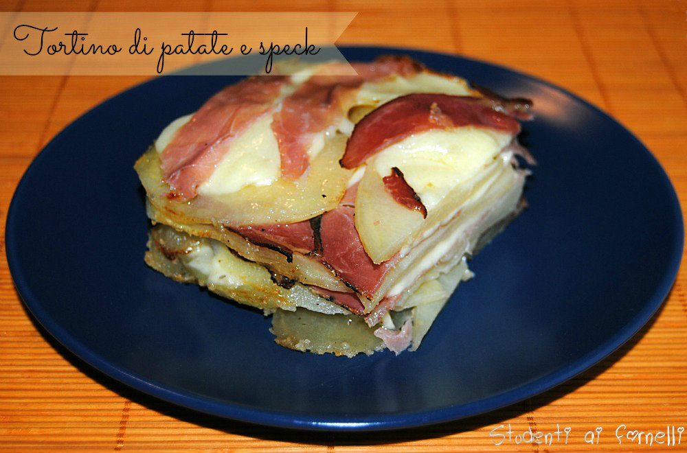 La ricetta è di facilissima esecuzione. Prima di tutto pelate le patate, lavatele sotto acqua corrente e tagliatele a rondelle dello spessore di circa mezzo centimetro. Cuocetele in padella con dell’olio di oliva, il sale, il rosmarino e tutte le spezie che preferite, dovranno risultare ben saporite. Se avete fretta di cuocerle potete aggiungere di tanto in tanto un po’ di acqua, aggiustando di sale secondo i vostri gusti. Quando saranno cotte lasciatele leggermente raffreddare e nel frattempo tagliate la scamorza a fettine. Volendo potete sostituirla con della provola o galbanino ma anche mozzarella. Oleate uno stampo da plum cake (va benissimo anche una pirofila, meglio rettangolare) e spolverizzate tutta la superficie con del pangrattato in modo da sformare il tortino più facilmente. Fate ora degli strati alternando patate e speck con le fettine si scamorza fino ad ultimare tutti gli ingredienti. Sull’ultimo strato di patate aggiungete ancora del pangrattato così da renderle croccanti. Infornate a 180° per circa 20 minuti.