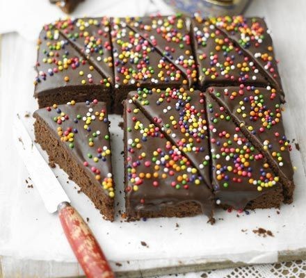 Versare questa glassa al cioccolato sulla torta e stendetela con una spatola o con un coltello a lama piatta, poi decorare il dolce con i confetti colorati.