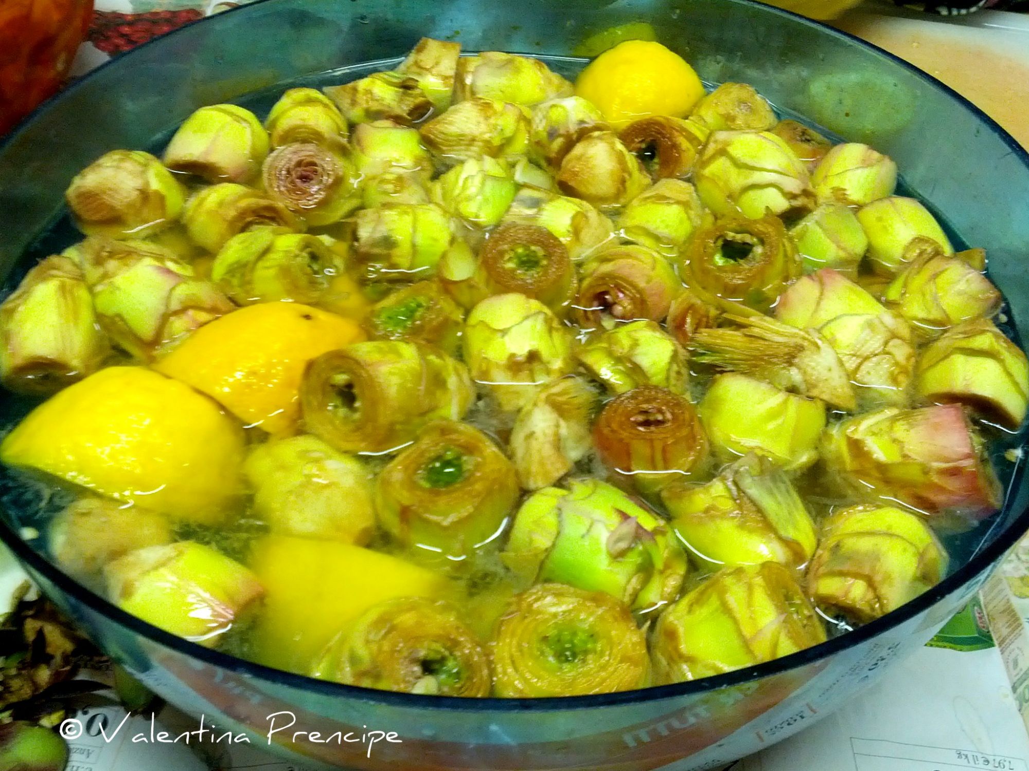 Mondate i carciofi privandoli delle foglie esterne più dure e delle cime con le spine; eliminate l’eventuale fieno interno e immergeteli a mano a mano in acqua acidulata con il succo di limone affinché non anneriscano.