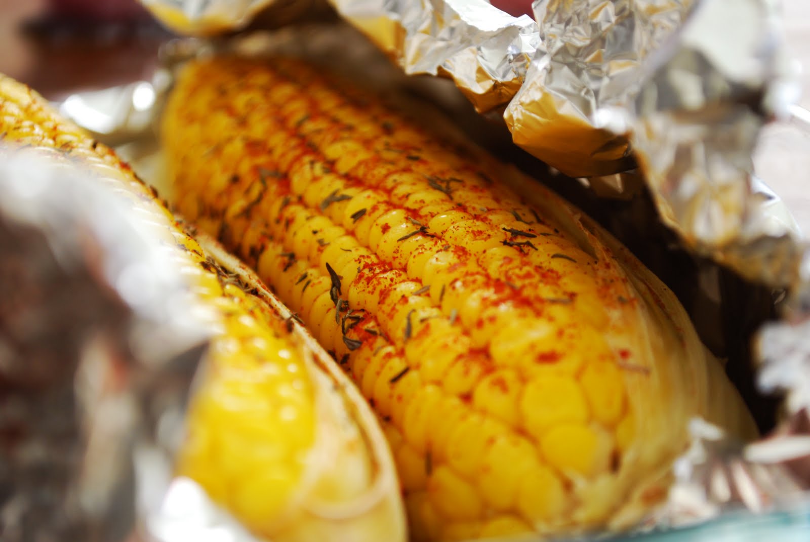 Tagliate 4 fogli di alluminio di dimensioni tali da poter contenere comodamente le pannocchie (più 4-5 cm di bordo per formare il cartoccio); su ogni foglio adagiate una pannocchia e ricopritela con il composto di burro fuso e spezie, poi chiudete il foglio formando un cartoccio a forma di caramella. Mettete i cartocci in forno a 220 gradi per 15 minuti, al termine servite aprendo i cartocci e formando una specie di "barchetta"; regolate di sale e pepe.