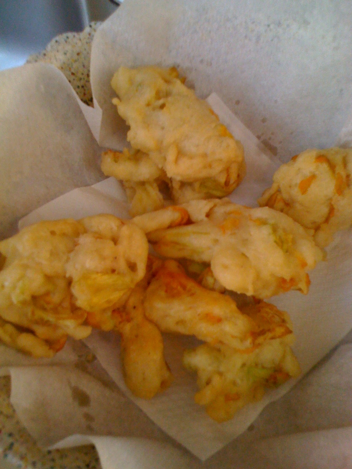 In una ciotola amalgamare la farina con le uova. Unire la cipolla, il prezzemolo, il parmigiano e amalgamare bene il tutto con una forchetta. Aggiungere gradualmente acqua fino ad ottenere la consistenza desiderata. Aggiungere il sale e mettere in frigo per circa 30 minuti. Nel frattempo, lavare, asciugare e pulire i fiori di zucca eliminando i sepali esterni. Impanare i fiori di zucca nella pastella uno per volta e friggerli nell’olio caldo fino a che non saranno ben dorati. Servire subito.