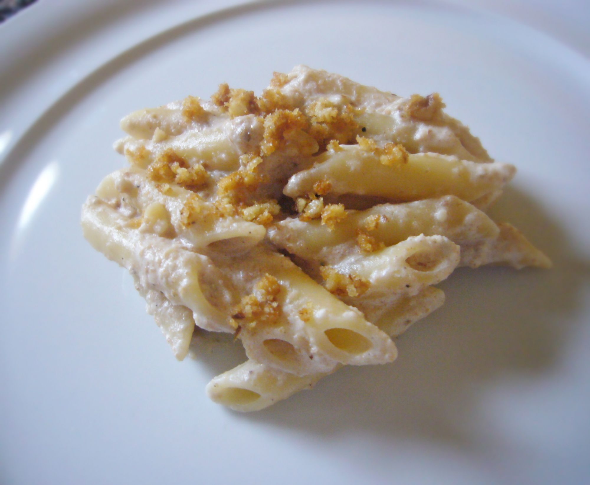 Cuocere le penne, al dente, in acqua salata. Tritare i gherigli di noci. In una padella far soffriggere l’aglio con l’olio, unire il pangrattato, le noci ed infine la ricotta o la panna. Salare, pepare e se è il caso diluire con qualche cucchiaio d’acqua di cottura. Unire la pasta e farla saltare con il condimento, se lo necessita, aggiungere ancora qualche cucchiaio d’acqua.