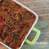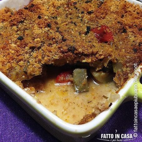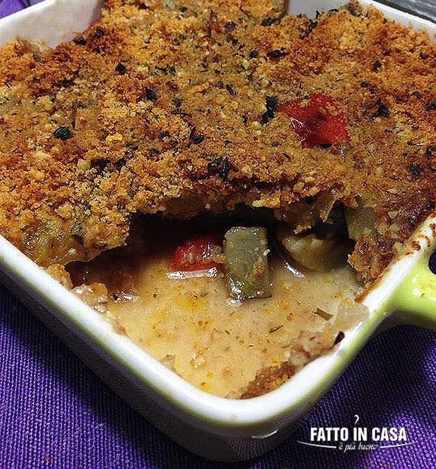 Una volta cotte le verdure, le mettiamo in delle pirofile e le ricopriamo con la panatura. Facciamo cuocere in forno per 20 minuti a 180°.