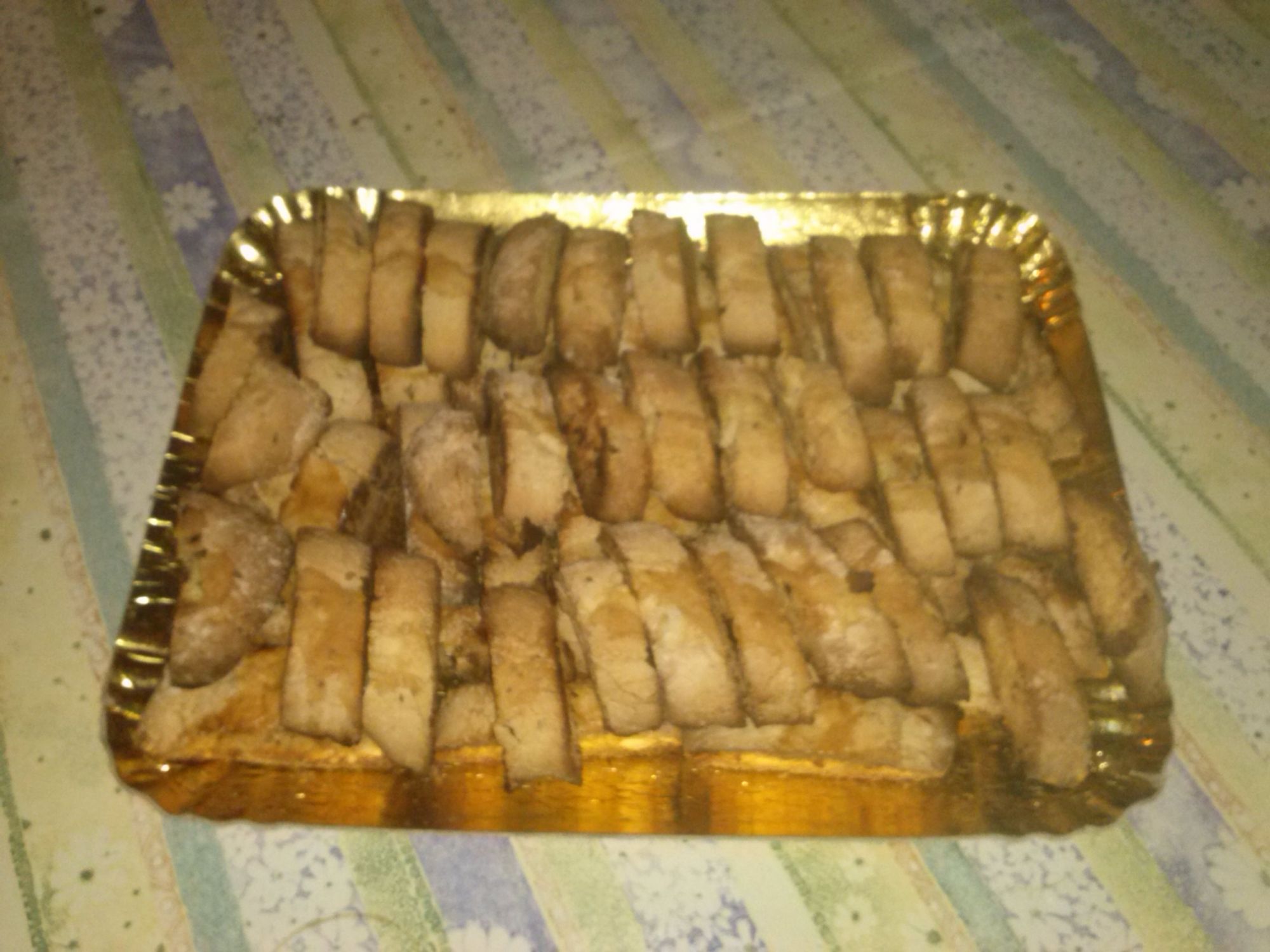 Tirare fuori la teglia dal forno e tagliare in diagonale i filoncini, voltare i cantucci e rimettere in forno per altri 10 minuti.