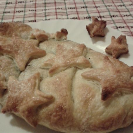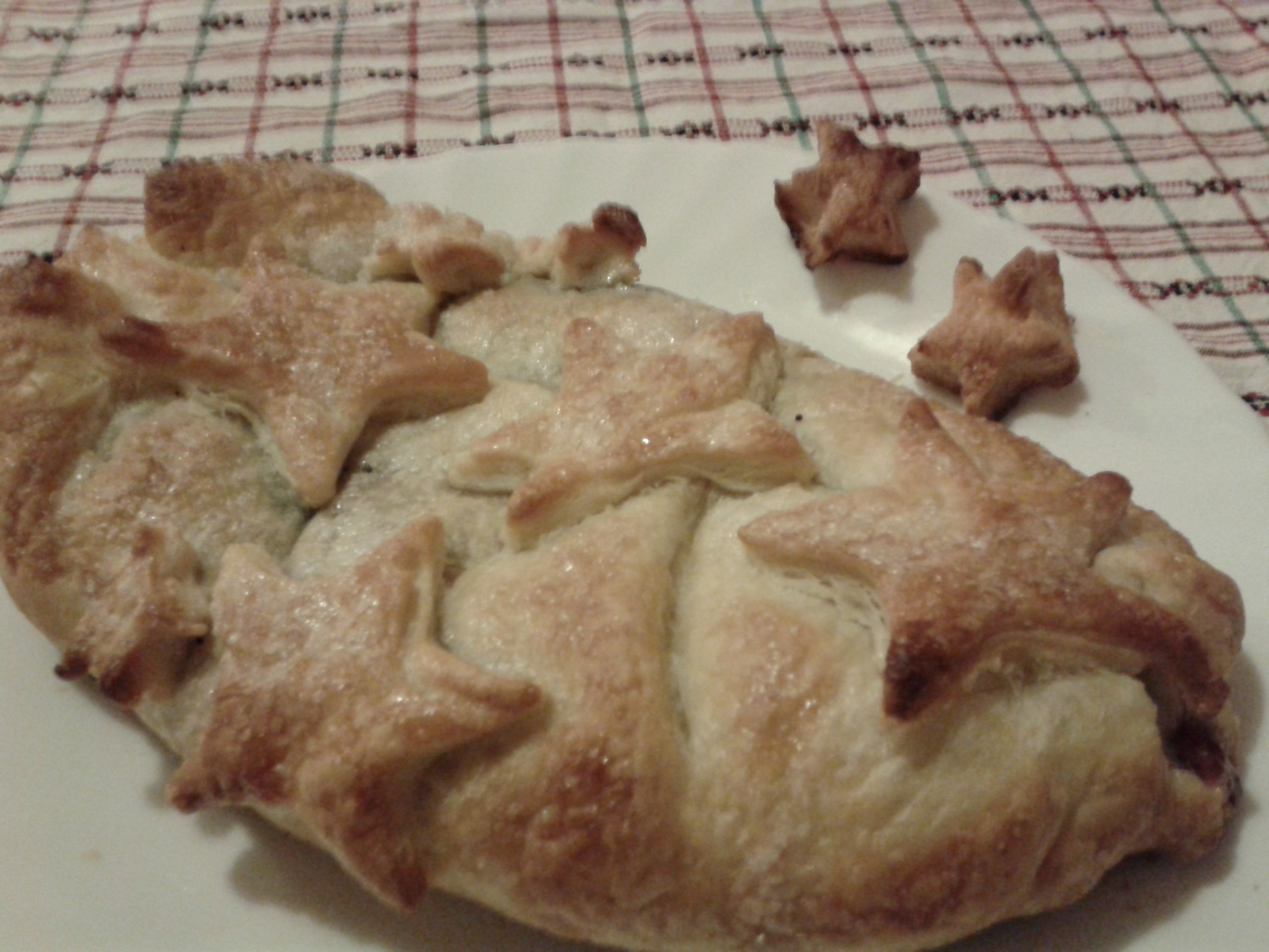 Aprire la confezione di pasta sfoglia e distenderla in modo delicato affinché non si rompa. Tagliarne via circa un terzo e metterla da parte. Sulla rimanente pasta adagiqre la mela tagliata a quadratini sottili e circa 2 bei cucchiai di marmellata, avendo cura di smalmarla per bene. Chiudere il fagottino. Con la rimanente pasta sfoglia, precedentemente messa da parte, fare delle stelline di varie misure con degli stampi per dolci. Adagiare le stelle sul fagottino. Spolverizzare con zucchero e bagnare con pochissima acqua in modo da sciogliere lo zucchero. Mettere il dolce in teglia antiaderente ricoperta di cartaforno e infornare a 180 gradi per 20 minuti circa.