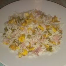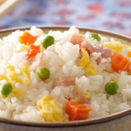 Iniziare sciacquando il riso sotto l'acqua fredda, scolarlo e cuocerlo per circa 10 minuti; intanto bollire i piselli; a parte tritare la cipolla e metà di questa unirla alle uova precedentemente sbattute. Strapazzare il tutto in una wok. Fare saltare in una pentola il prosciutto e i piselli; Far soffriggere il resto della cipolla e aggiungere il riso e la salsa di soia e dopo qualche minuto il resto del condimento