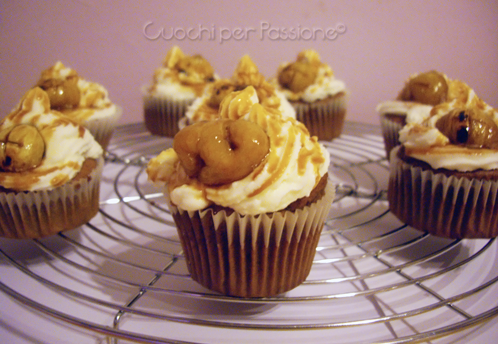 degli amici mi hanno portato le castagne che hanno raccolto, erano più di un chilo, per cui mi son detta: “devo ingegnarmi e farci qualcosa di buono!” avevo in casa anche la farina di castagne e quindi pronti via ecco l’idea, i cupcakes autunnali alla farina di castagne con castagne glassate e frosting alla panna e mascarpone, una sorta di Mont-blanc in miniatura rivisitati.