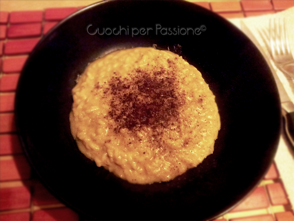 Ecco un primo piatto di stagione, molto saporito e che potrete guarnire con dell’ottimo cacao amaro, vi presento il risotto alla zucca e taleggio.