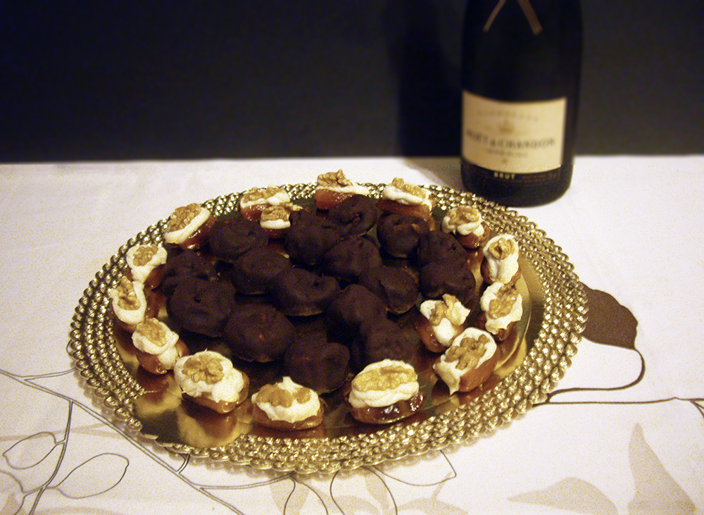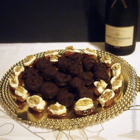 Riempite una sac à poche, con bocchetta a stella, con la crema di mascarpone e farcite i datteri, quindi adagiate mezzo gheriglio di noce su ognuno.