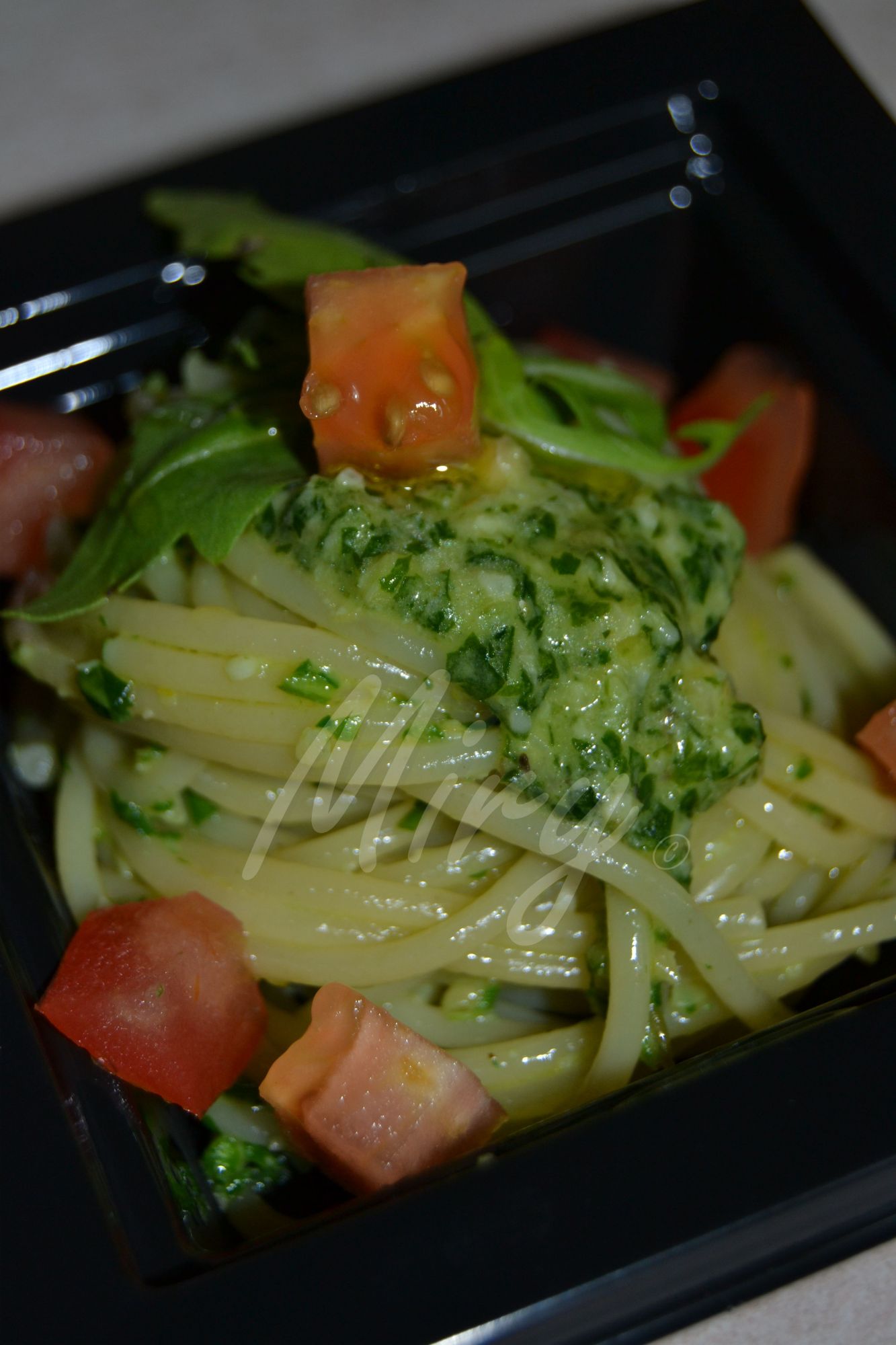 Spaghetti con pesto di rucola e mandorle con cubetti di pomodoro