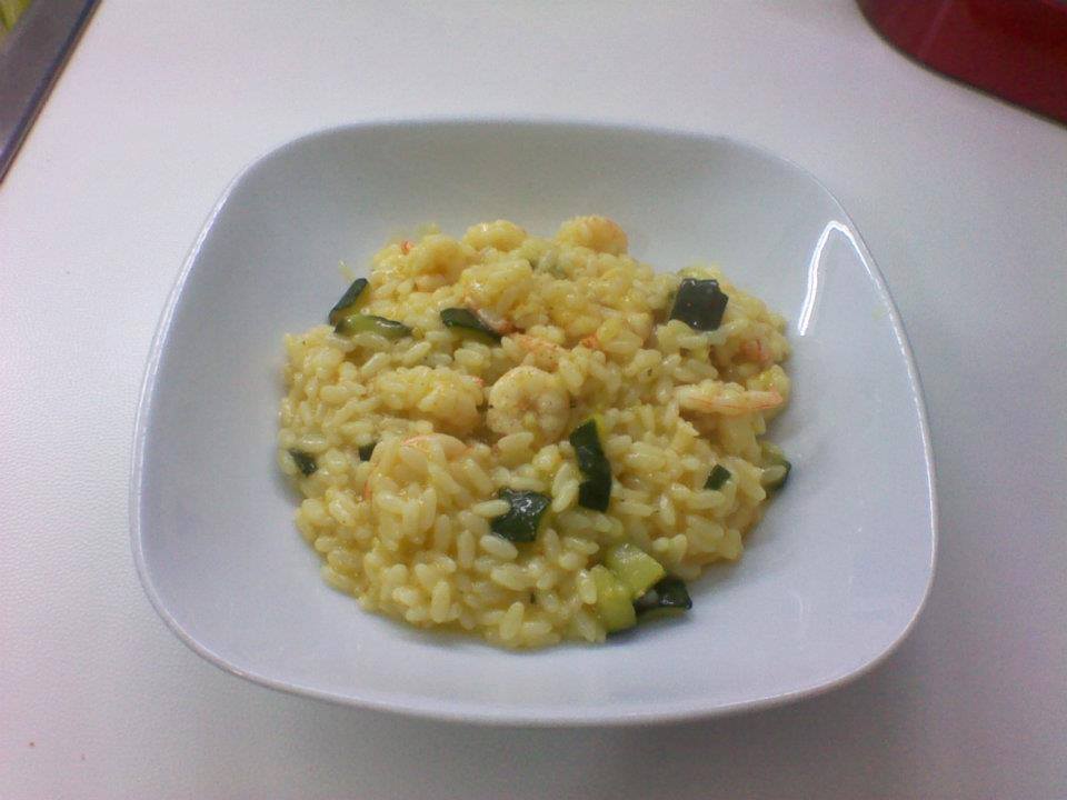 Ho pulito i gamberetti e ho messo a bollire le teste dei gamberetti in una pentola con abbondante acqua, in modo da fare un brodetto per il risotto! Nella pentola a pressione ho rosolato la cipolla con un cucchiaio di olio, ho inserito la zucchina tagliata a cubetti, dopodiché ho aggiunto qualche gamberetto, poi il riso, ho sfumato con mezzo bicchiere di vino bianco. Una volta asciugato il vino ho inserito il resto dei gamberetti e il brodo dei gamberetti, circa 380 gr (3 bicchieri colmi) e il dado vegetale. Ho chiuso la pentola, ho cotto, dopo il fischio, per 10 minuti esatti a fuoco lento. Dopodichè prima di servire, nel tegame stesso, ho aggiunto il curry, che dà il tocco di particolarità e lega benissimo con il resto degli ingredienti! Provatelo!!