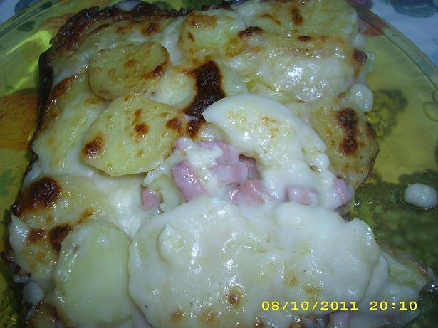 Prendere la teglia, cospargere di olio, poi mettere uno strato di patate,sopra sale e pepe, poi metà besciamella, coprire con le fette di spek,poi sopra a queste le fette di provola, un altro strato di patate, sale e pepe sulle patate, il resto della besciamella, una grattugiata di parmigiano, fiocchetti di burro ed infornare a 250 °C il tempo che si fa la crosticina di gratinatura.