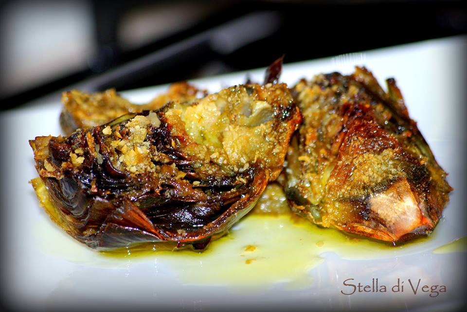 Ho tagliato i carciofi in quattro parti (erano belli grandi) e li ho messi in teglia insaporiti per bene anche all'interno con olio, sale, pepe, uno spicchio di aglio, mentuccia freschissima, parmigiano (se piace) e pochissima acqua sul fondo. Ho cosparso la superficie di abbondante pangrattato e ho lasciato cuocere a 180°/190° in forno già caldo per circa 50 minuti
