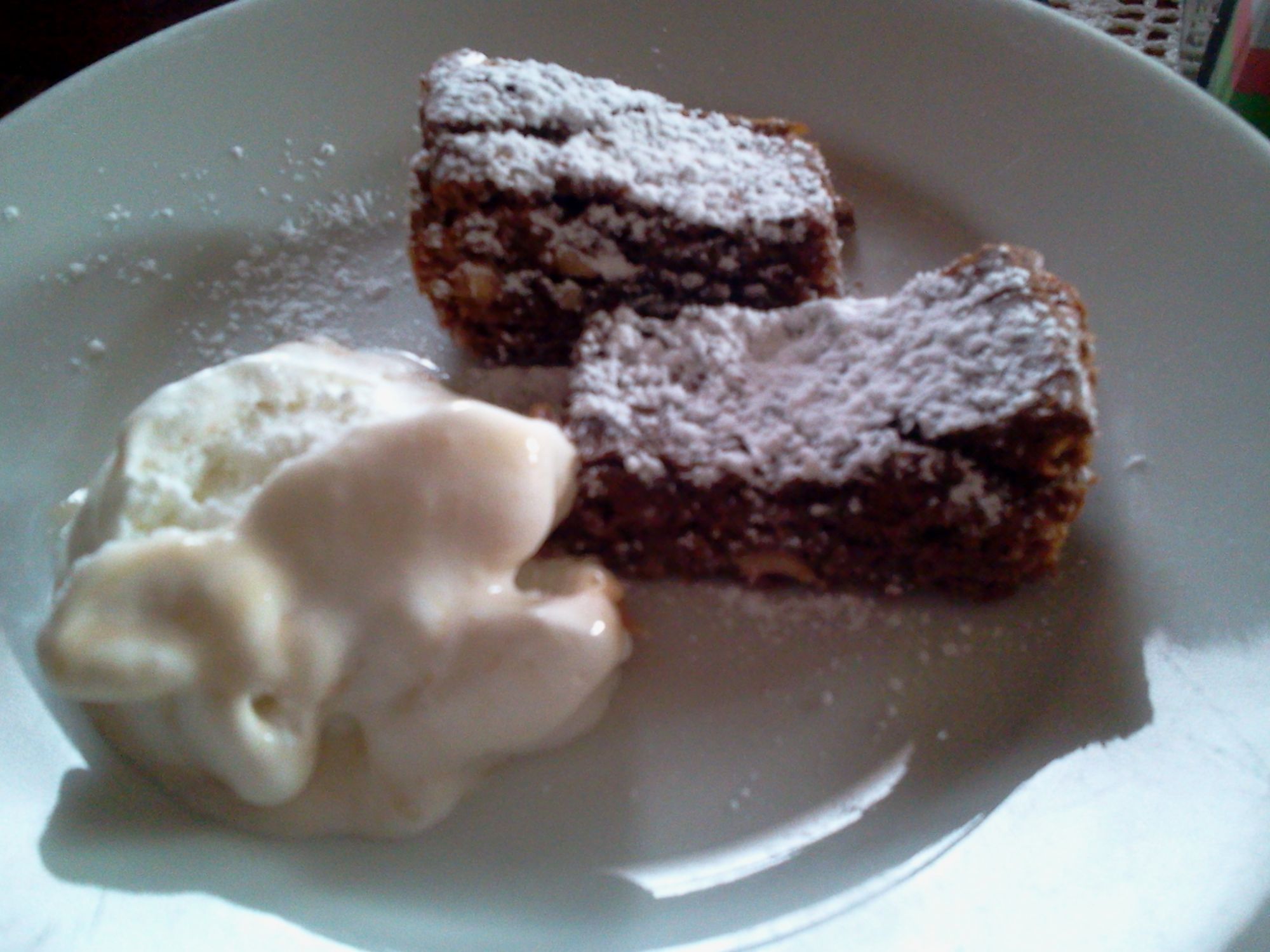 Servite i brownies intiepiditi, spolverate con zucchero a velo e impiattate con una pallina di gelato ala vaniglia.