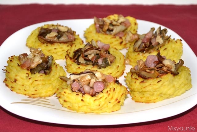 Quando i nidi di patate saranno dorati, farcirli con il ripieno ottenuto