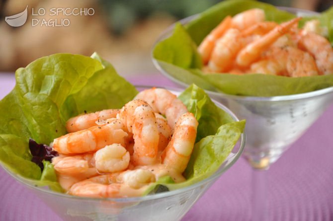 Foderare due coppette con le foglie di lattuga ben lavate ed asciugate, quindi disporre il radicchio tritato. Unire la salsa rosa, i gamberetti ed una grattugiata di pepe.