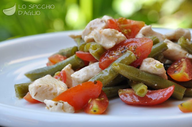 Unire i fagiolini e i pomodori al pollo e mescolare.