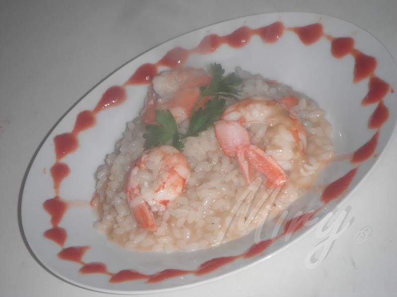 Pulire i gamberoni, separando le teste e unendole alla padella col soffritto. Unire il riso, farlo tostare qualche minuto e sfumare col vino. Aggiungere il brodo di tanto in tanto. Sgusciare i corpi dei gamberoni e aggiungerli al riso a metà cottura. Aggiustare di sale e pepe e raggiungere la cottura.