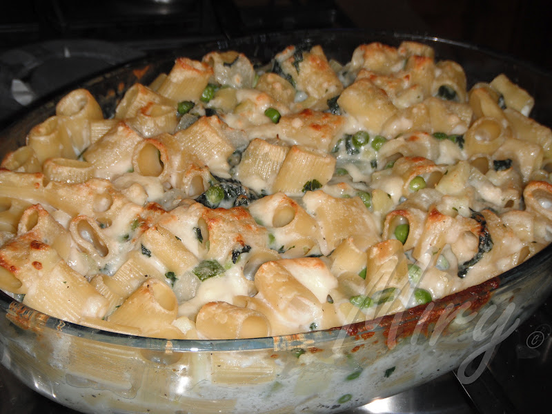 Cuocerela pasta in acqua bollente salata e scolarla molto al dente. Tagliare a cubetti la fontina e condire la pasta con le verdure, la besciamella e i cubetti di fontina. Mettere tutto in una pirofila di pirex e cospargere con abbondante parmigiano grattugiato.