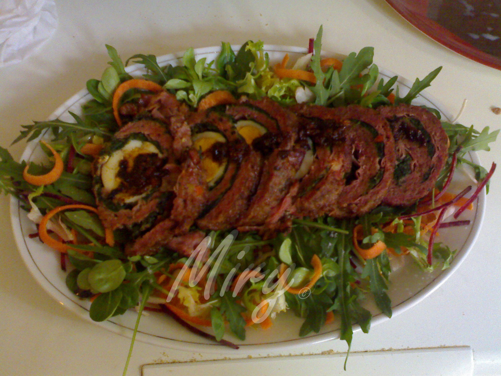 Trasferire il polpettone in un tagliere, lasciarle freddare leggermente per poterlo tagliare, fare a fettine e adagiarlo su un letto di verdurine fresche e croccanti e cospargere con la salsina di balsamico.