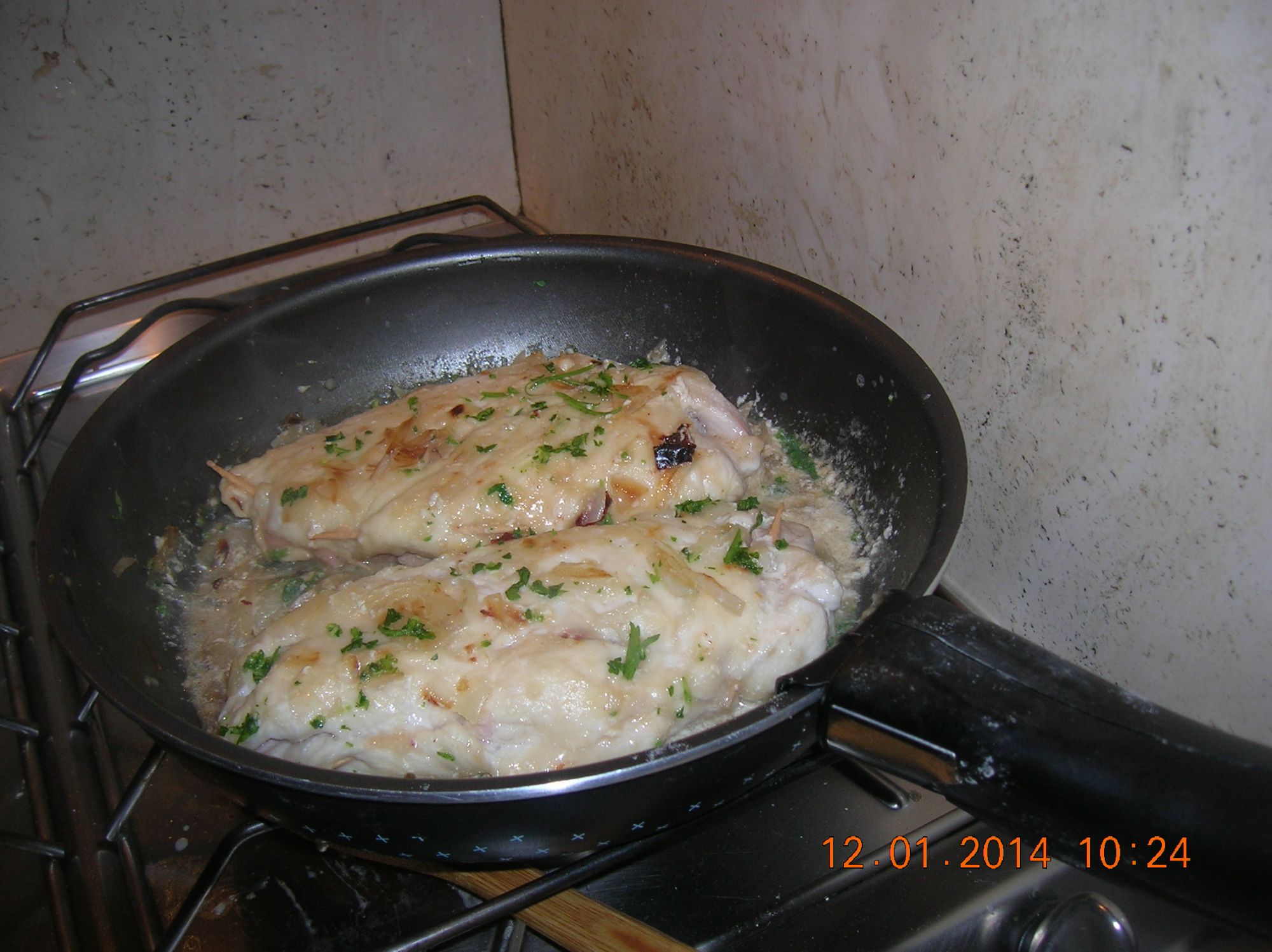HO PRESO DUE PETTI DI POLLO FATTI TAGLIARE DOPPI E LI HO BATTUTI BEN BENE ...E LI HO FARCITI CON FETTINE DI PROSCIUTTO E DI RICOTTA SECCA...PIU' UN POMODORO SECCO.... HO POI INFARINATO E CHIUSO CON STUZZICADENTI ...HO FATTO ROSOLARE CIPOLLA IN UNA PADELLA ANTIADERENTE.... POI HO MESSO IL PETTO DI POLLO..E FATTO ROSOLARE DA AMBO LE PARTI PER 5' CADAUNO..VERSATO MEZZO BICCHIERE DI VINO BIANCO ..FATTO EVAPORARE...DUE DITA DI LATTE PARZIALMENTE SCREMATO E FATTO RAFFINARE...SCAGLIE DI RICOTTA SECCA ...E VOILA'!!COSTO: € 3,50