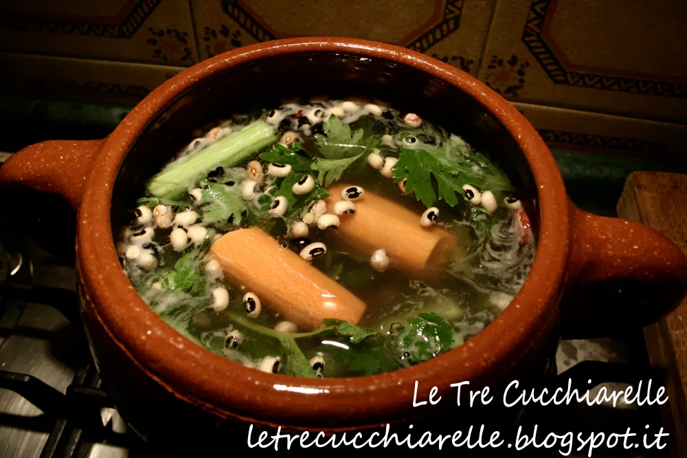 Mettere 3 lt di acqua tiepida (0.75 ml per 100 grammi di legumi e cereali secchi) nella casseruola inserendo anche i legumi e i cereali appena lavati, il sedano e una carota (potete farla anche a pezzettini, io l'ho spezzata a metà per problemi di allergie di mia sorella).