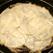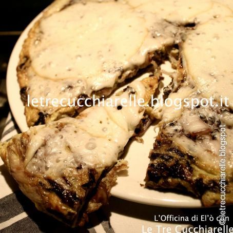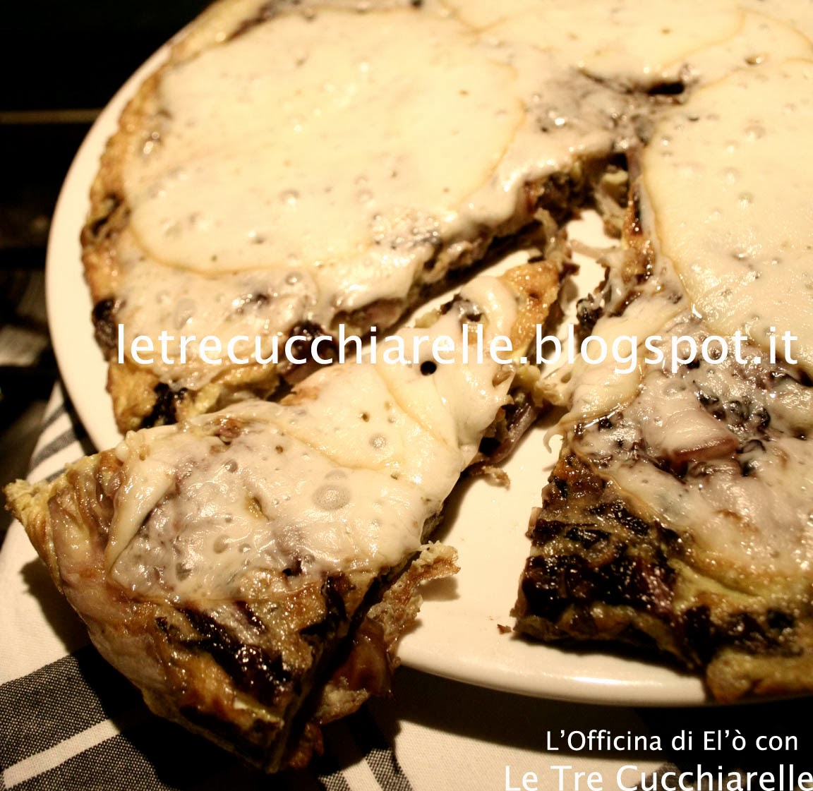 Una volta che il radicchio si sarà appassito per bene aggiungere le uova sbattute e lasciare cuocere a fuoco basso, quando la parte sotto si sarà cotta girare la frittata (io mi sono aiutata con un coperchio di una pentola) e mettere sopra le fettine di provola affumicata.