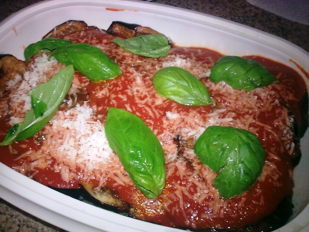 Soffriggere la cipolla tagliata finemente, quindi aggiungere la passata di pomodoro, preparata precedentemente, aggiungere qualche foglia di basilico, aggiustare di sale, pepe e qualche cucchiaino di zucchero. Far cuocere fin quando otterrete un sugo abbastanza denso. A questo punto, in una pirofila rettangolare, adagiare uno strato di melanzane fritte, ricoprirle con il sugo, spolverare del formaggio grattugiato che avrete deciso di utilizzare e concludere con qualche fogliolina di basilico. Procedere così fino ad esaurimento degli ingredienti, tenendo presente che lo strato finale dovrà essere: strato di melanzane fritte ricoperte di sugo e infine abbondante formaggio grattugiato e foglioline di basilico.