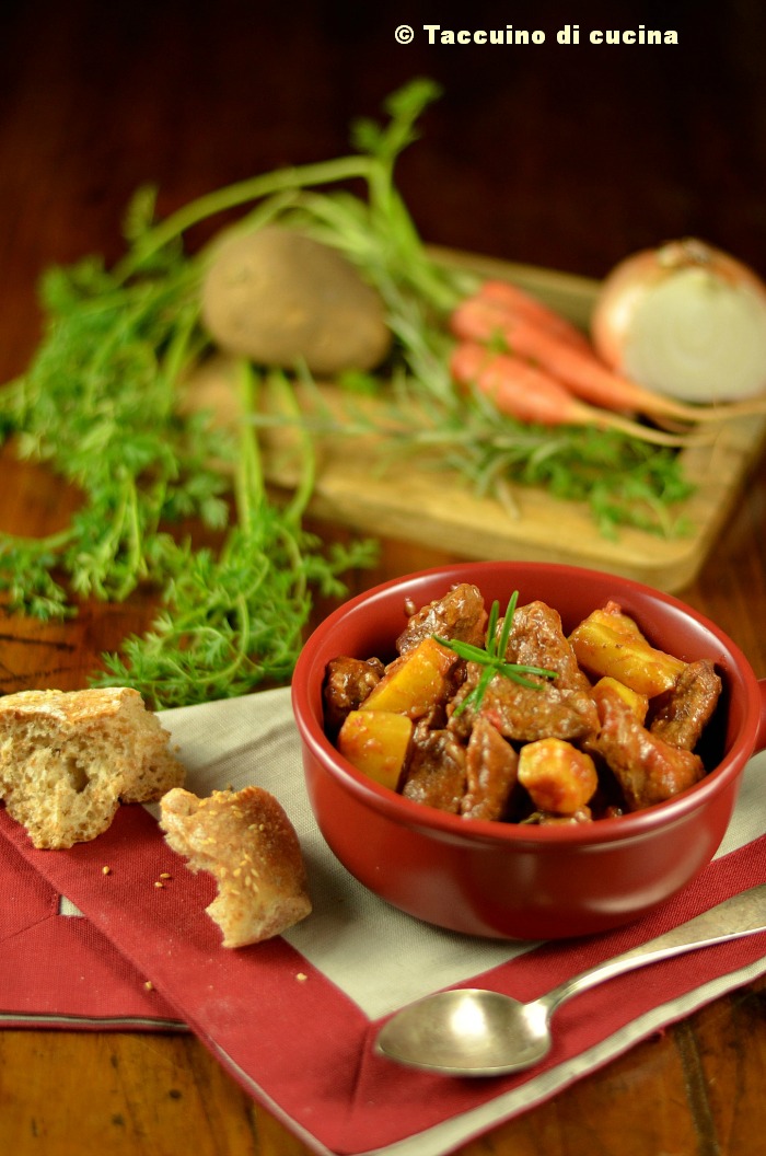 Una volta messi tutti nel tegame alza la fiamma, innaffiali con il mezzo vino rosso e lascia evaporare a fuoco alto. Aggiungi la paprika, il concentrato di pomodoro sciolto in un po’ di brodo caldo, la passata di pomodoro e poi brodo sufficiente a coprire la carne. Fai sobollire molto lentamente per almeno due ore e mezza . Dovesse asciugarsi durante la cottura man mano versa ancora brodo caldo. Aggiungi il rametto di rosmarino e le patate tagliate a tocchetti e cuoci ancora per circa mezz’ora, o fin quando le patate diventano morbide.