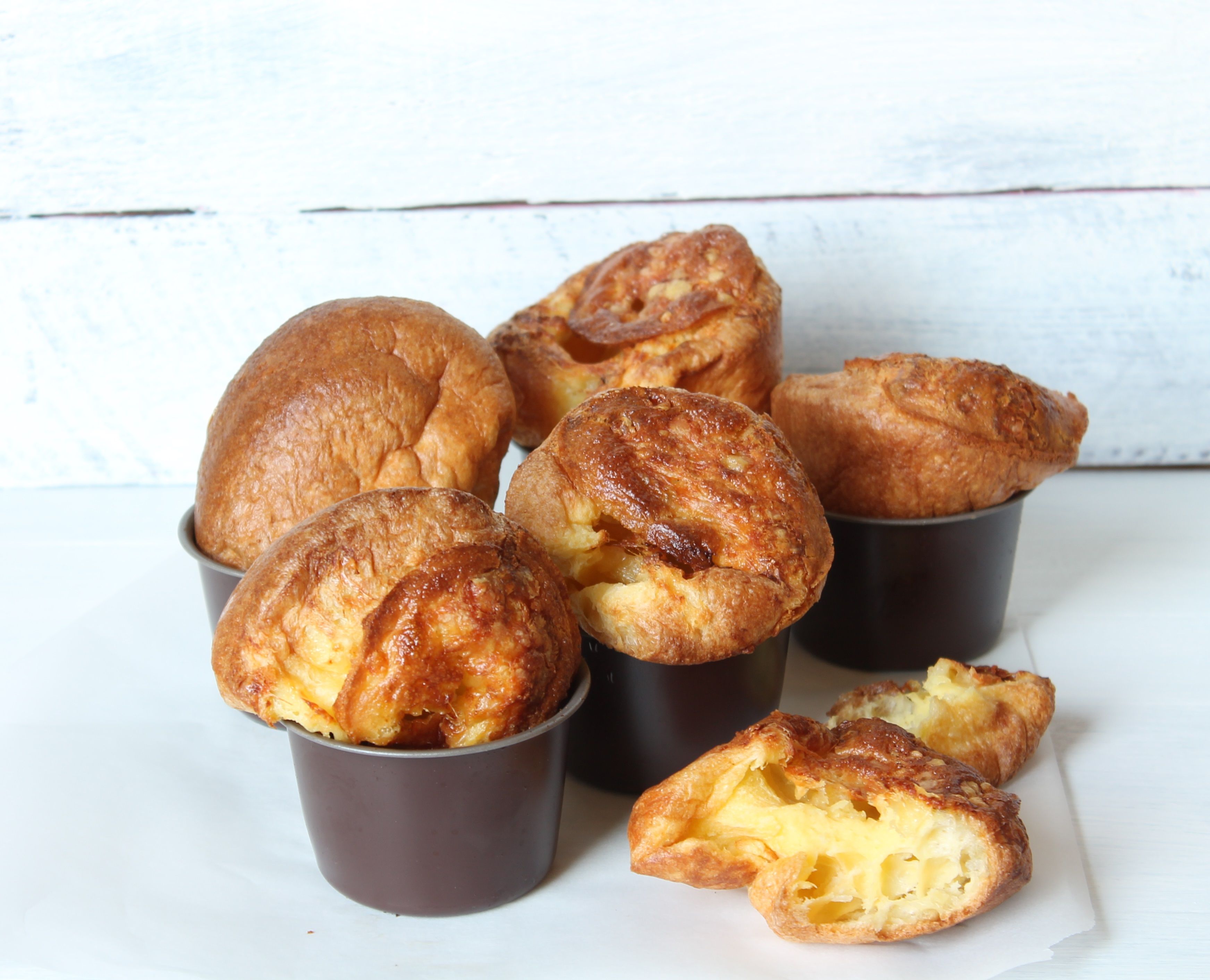 Scaldare gli stampi (io ho usato dei semplici stampi cilindrici) nel forno per qualche minuto (sembra che i popovers crescano di più), poi spennellarli abbondantemente con il burro. Riempire ogni stampo di impasto, poco oltre la metà. Cospargere con il formaggio rimasto e cuocere per 20 minuti, non aprire il forno prima del termine della cottura.