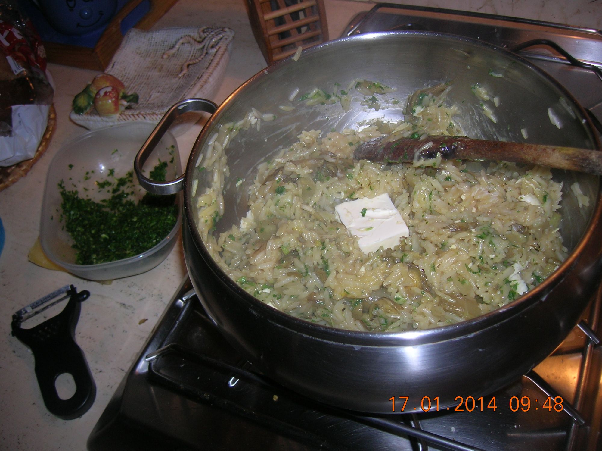 - INGREDIENTI : 250gr. di riso basmati .. 2 carcioffi crudi ...mezza cipolla un aglio ..manciata di prezzemolo e aglio...pizzico di curcuma..di saporita...di sale .. mezzo dito di vino bianco ..due tazze di acqua calda , due dadi ...olio e.v. o...q.b. 30gr. di margarina vegetale...5gr. di ricotta secca a scaglie e 10gr. di grana a scaglie