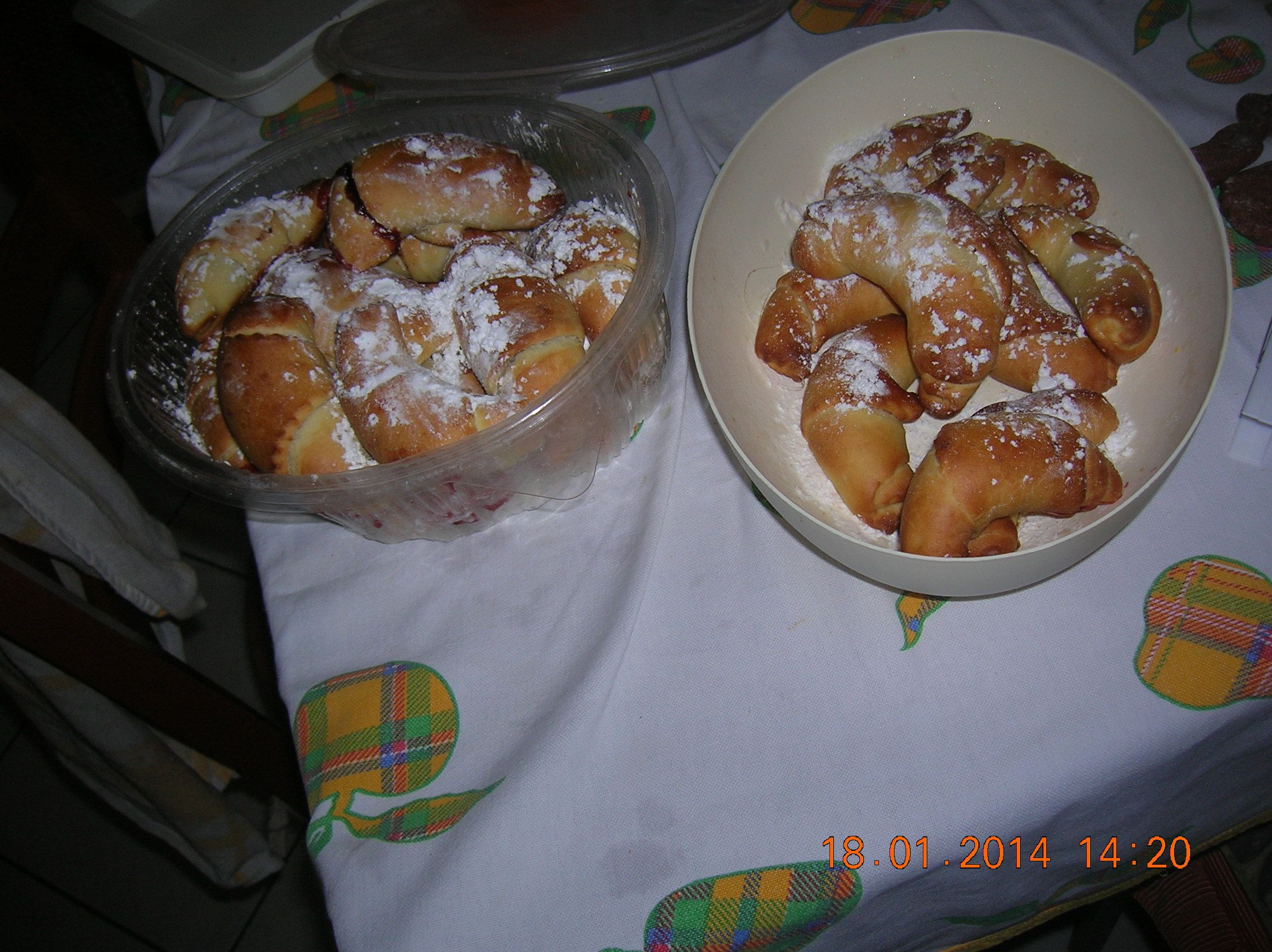 Poi dopo circa 2 ore ho steso l'impasto in un piano ben infarinato e con la rotella rigata ho fatto dei triangoli che poi ho ripiegato mettendo la punta volta verso il basso...messo su teglia rivestita dicarta da forno....alcuni li ho farciti con un cucchiaino messo al centro di nutella o marmellata... li ho coperti con un telo e li ho lasciati riposare per 120'....