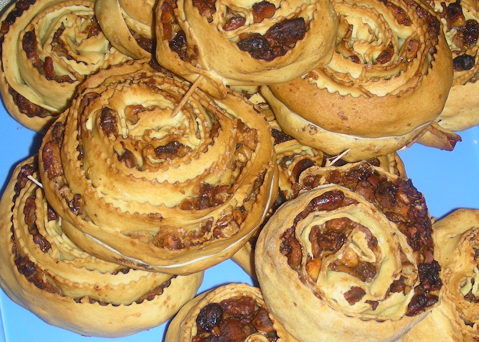 Amalgamare bene il tutto. Stendere finemente la pasta, creare delle strisce lunghe e sottili, adagiare il ripieno, richiuderle e girarle a spirale.