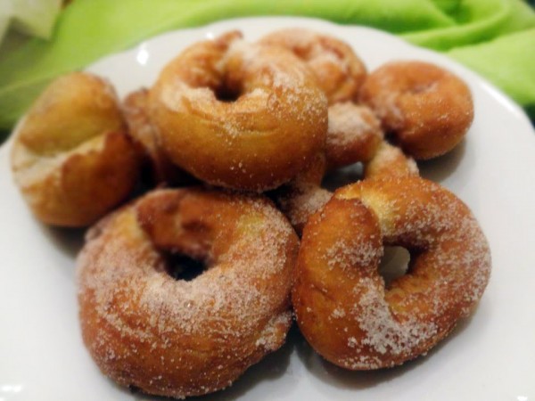 Amalgamare tutti gli ingredienti, creare delle ciambelline e friggere. Cospargere di zucchero.