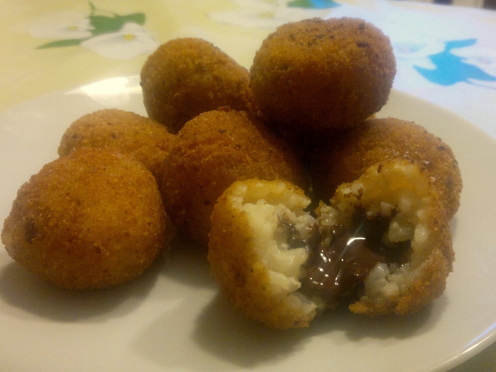 Quando si sarà raffreddato, metto uno strato di riso sul palmo della mano in modo da formare un incavo al centro e colloco nell’incavo un pezzetto di cioccolato. Richiudo con un altro po’ di riso e compatto l’arancino tra le mani per far uscire l’aria. Quindi passo gli arancini al cioccolato prima in una miscela molto cremosa di acqua e farina e successivamente nel pangrattato.
