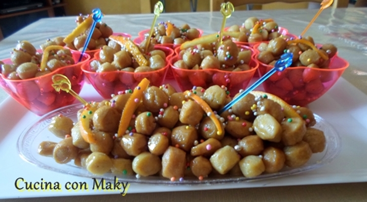 Gli struffoli sono una ricetta tipica campana. Sono tante piccole palline fritte e glassate col miele, decorate con confettini e canditi a piacere.