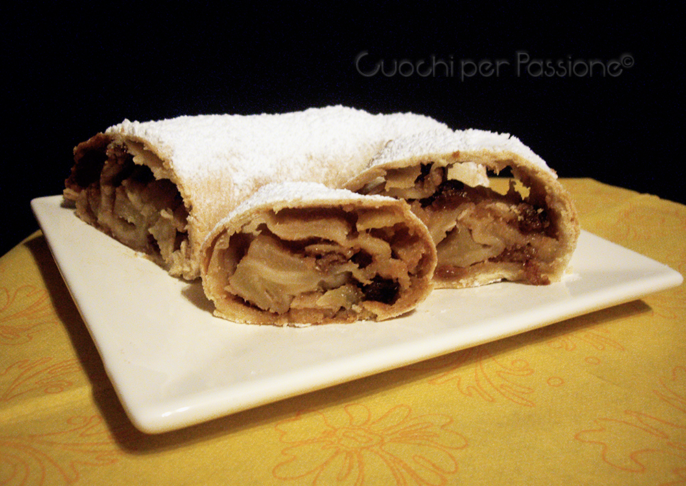 Sfornate lo strudel e mettetelo a raffreddare coprendolo con un canovaccio, quando sarà tiepido, cospargetelo di zucchero a velo, tagliatelo a fette e servitelo.