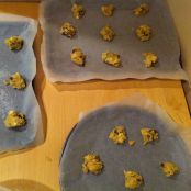 Ora con l’aiuto di due cucchiai prendiamo dell’impasto e lo adagiamo nella teglia da forno foderata con della carta da forno,mettiamo giusto una punta di impasto e cosi via cercando di lasciare dello spazio tra di loro, perché il biscotto tende ad allargarsi e ad appiattirsi.