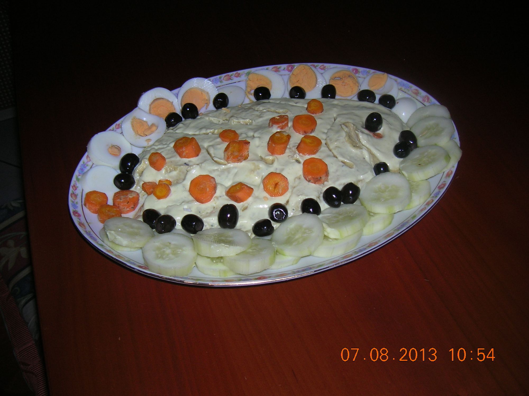 ho messo nel piatto di portata per far freddare prima di dare la forma del pesce... poi dopo un'ora ho dato la forma e ricoperto di maionese...rimesso in frigo per altra oretta...poi per uarnire ho preparato due uova sode...due carote sbollentate...un cetriolo e olive nere e un pomodoro .