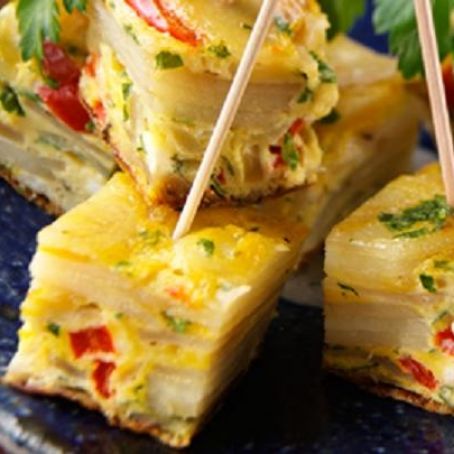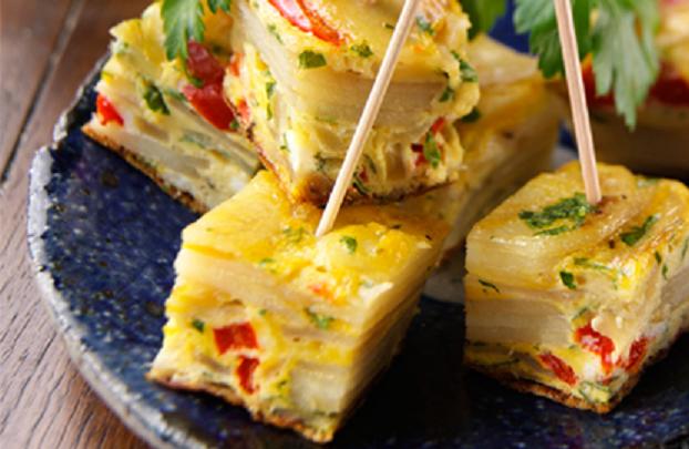 Trasferite le verdure in uno stampo da forno foderato con carta da forno: versatevi sopra il composto di uova, quindi cuocete nel forno preriscaldato a 190 °C per 25 minuti. Servite la tortilla tiepida tagliata a dadi.
