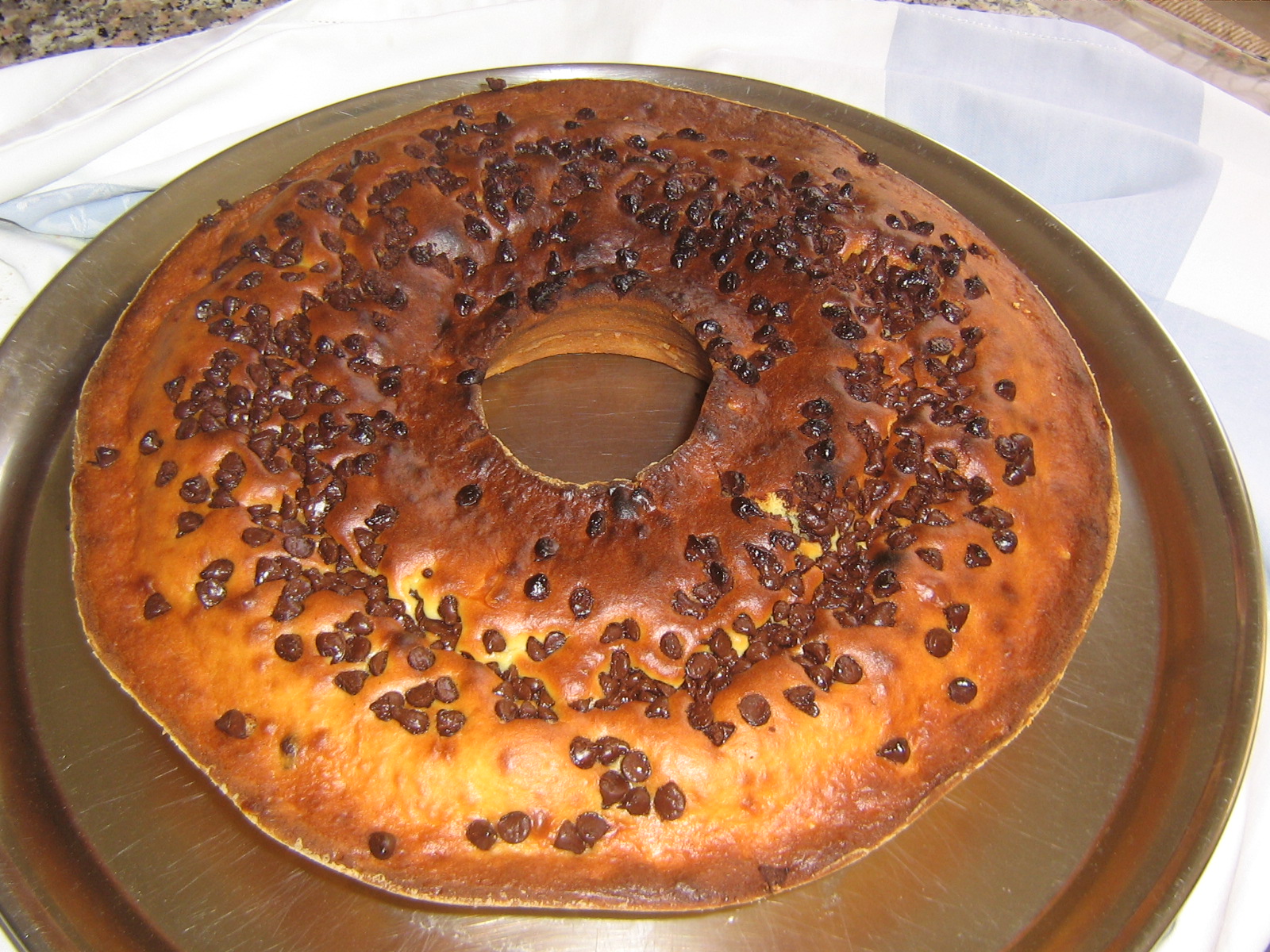 Mescolare il tutto e versare nello stampo da plumcake imburrato e infarinato, cospargere il composto con 3 cucchiai di gocce di cioccolato.