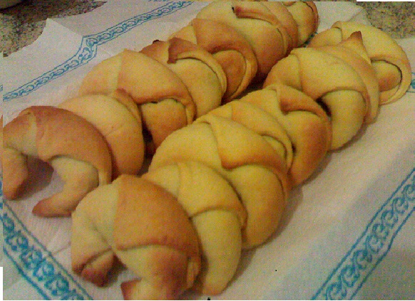 Dividere in 6 parti l'impasto ottenuto e stenderlo in tondo. Dividere in 8 triangoli il cerchio e spalmare nutella o marmellata sulla parte più larga del triangolo.